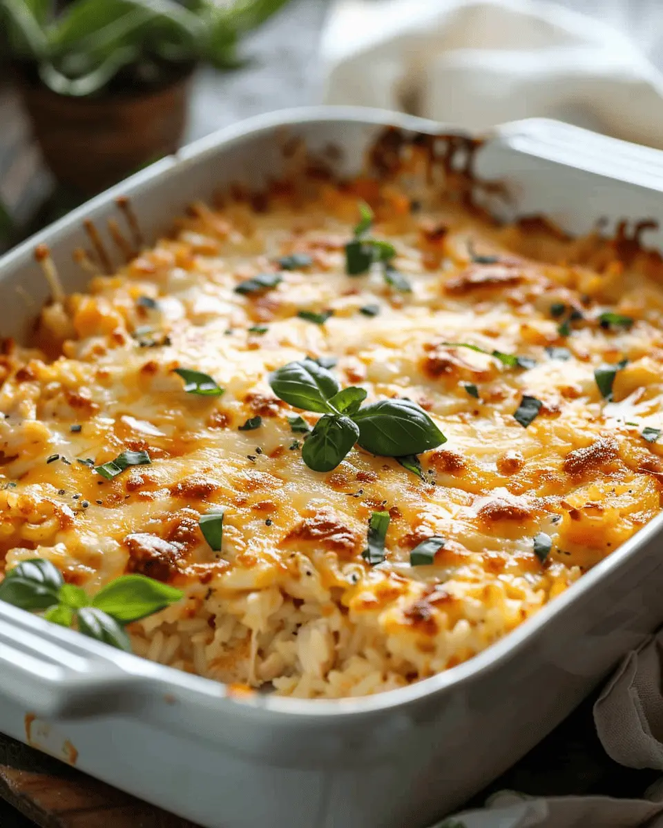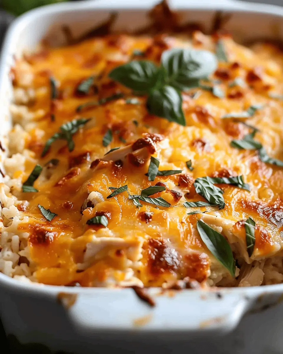 For the best results, preheat your oven to 350°F (175°C). Bake your cheesy chicken and rice casserole covered with foil for the first 30 minutes. This allows the flavors to meld beautifully while keeping the dish moist. Remove the foil for the last 15-20 minutes to achieve that golden, bubbly cheese topping. Trust me, this timing makes all the difference!