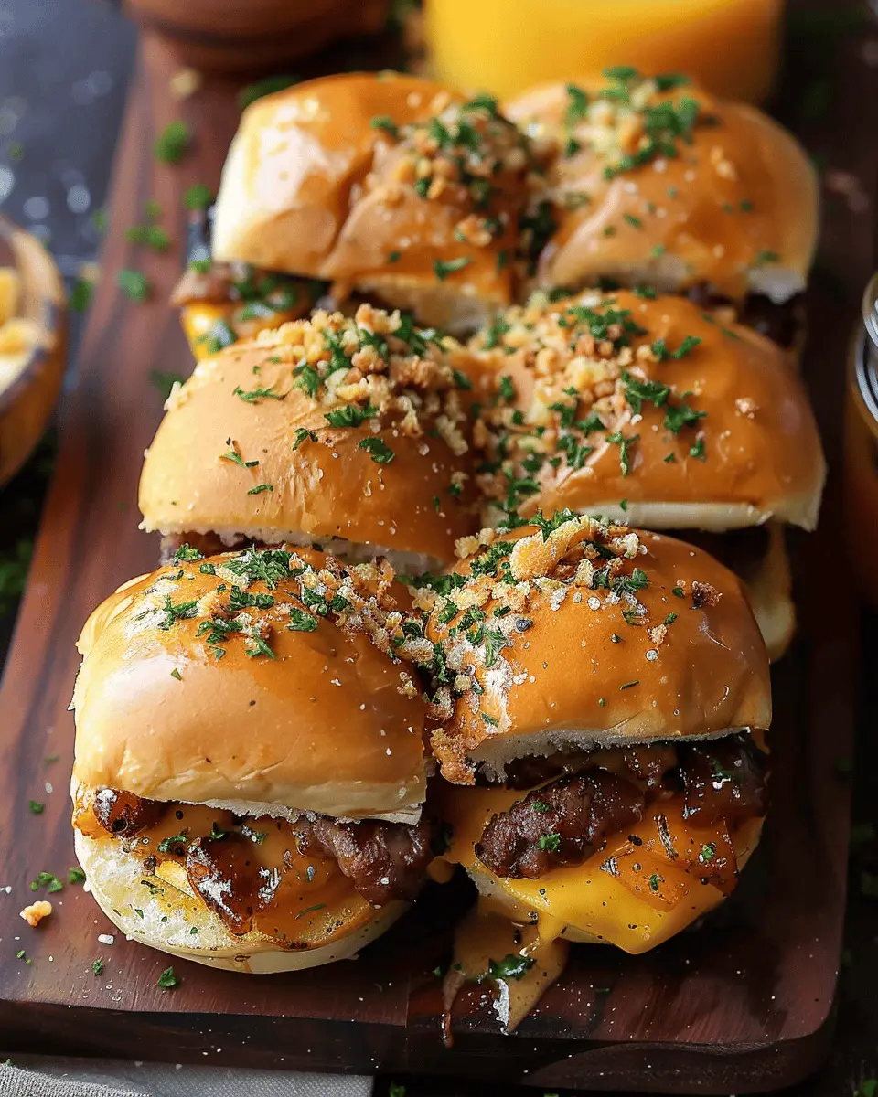 - Place the tops on the sliders and bake in the preheated oven for 5-7 minutes until the cheese is melted.