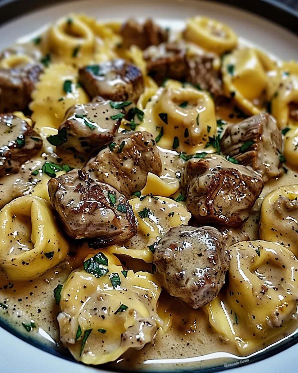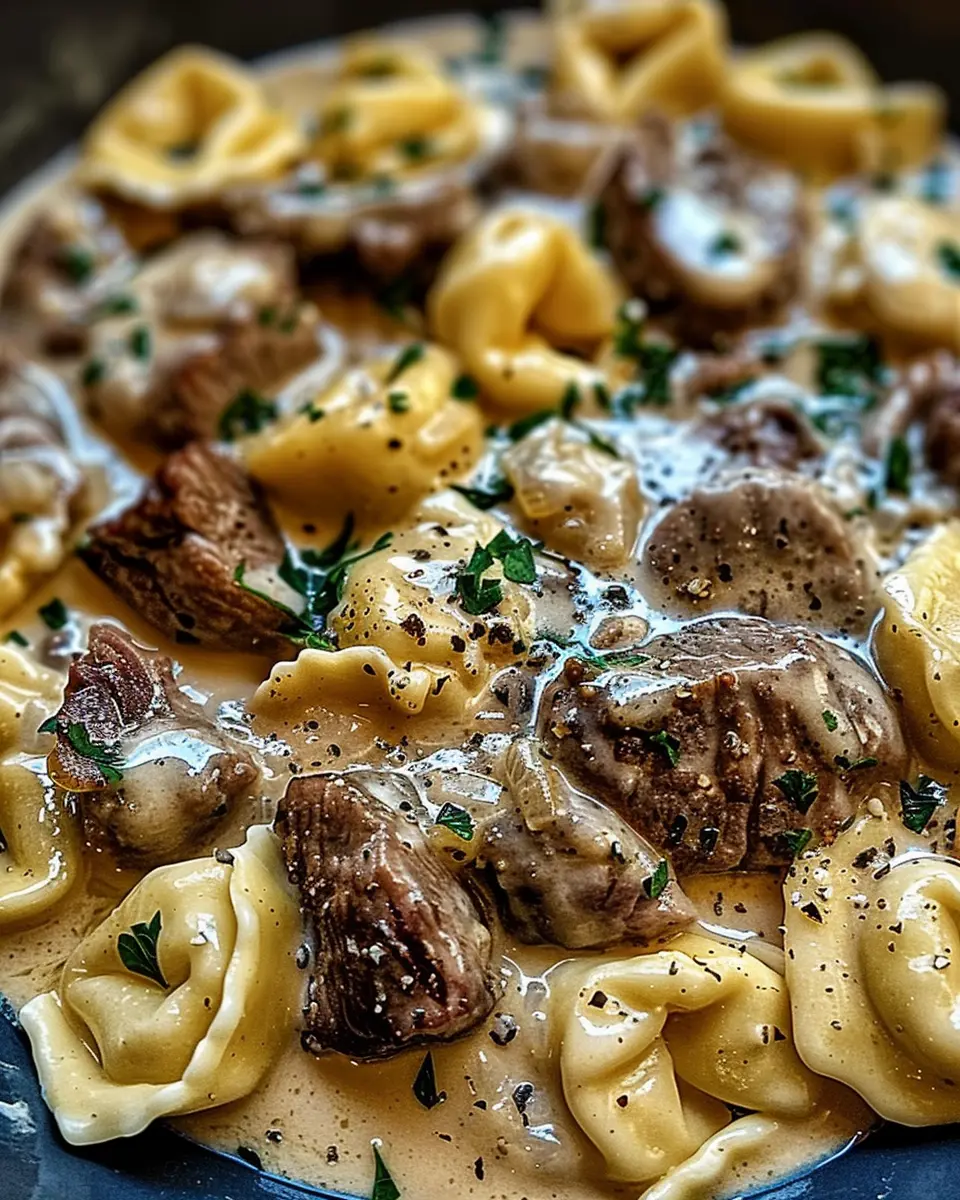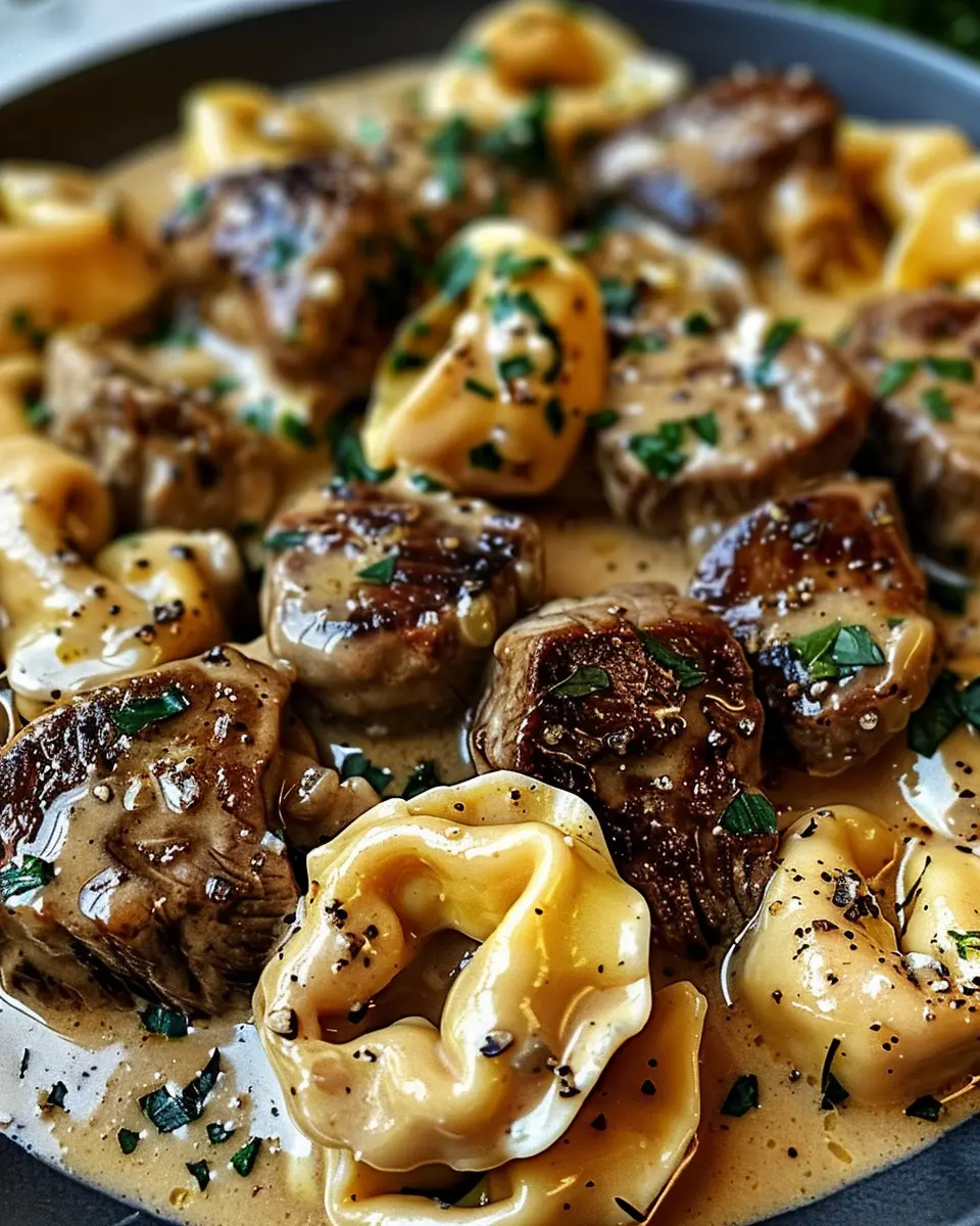 A delicious dish featuring tender steak and tortellini in a rich creamhouse sauce.