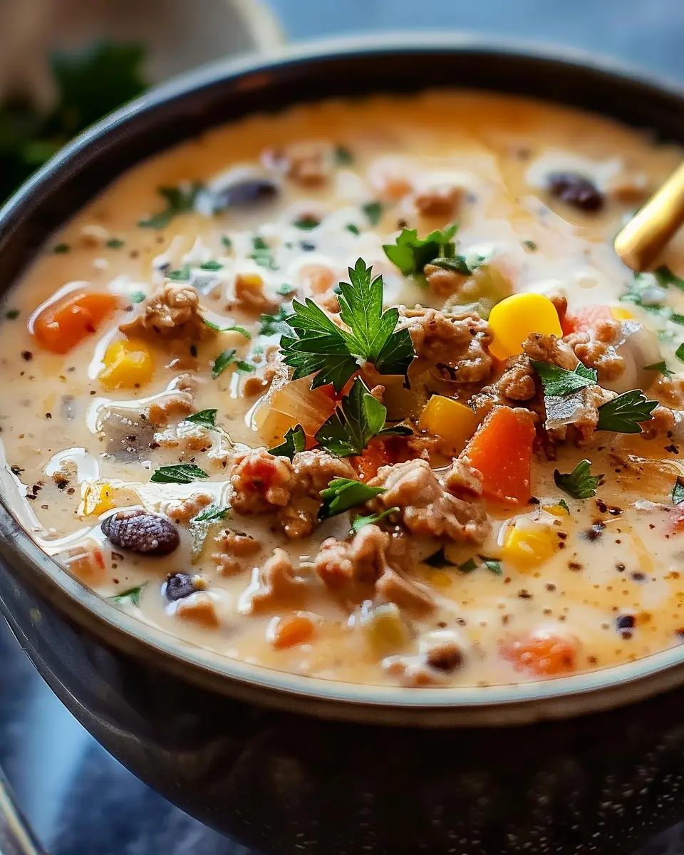 Indulge in this creamy cowboy soup loaded with turkey bacon, beans, and veggies, perfect for a comforting weeknight meal.