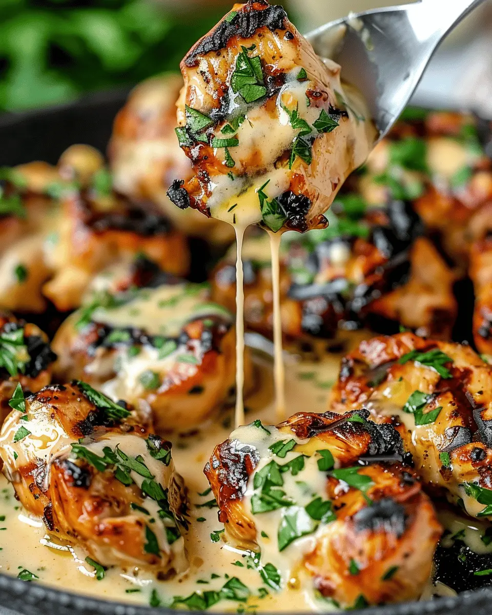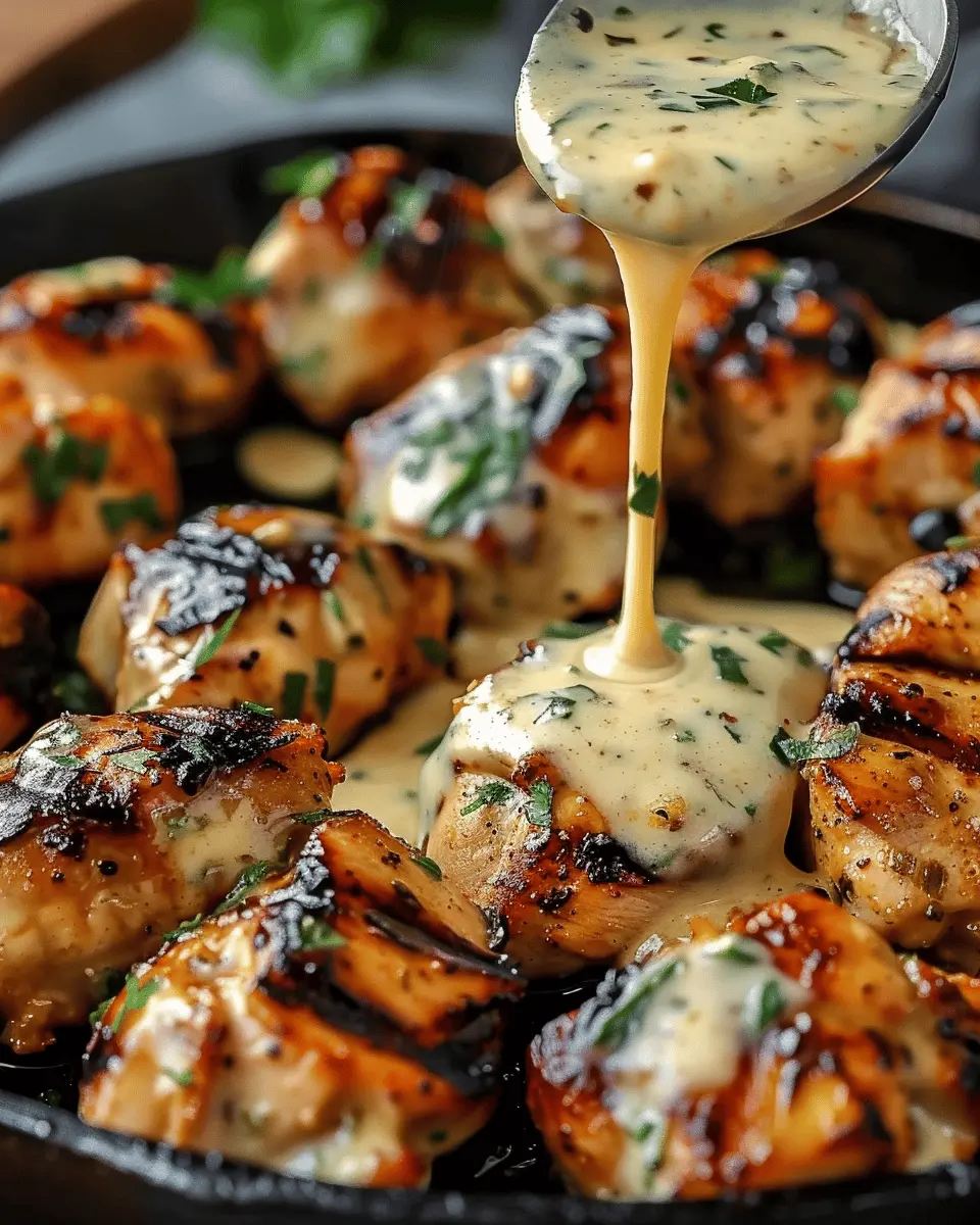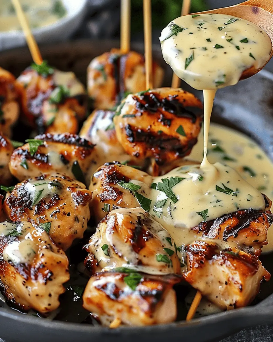 This creamy garlic sauce is the perfect complement to grilled chicken bites, adding rich flavor and a delightful texture.