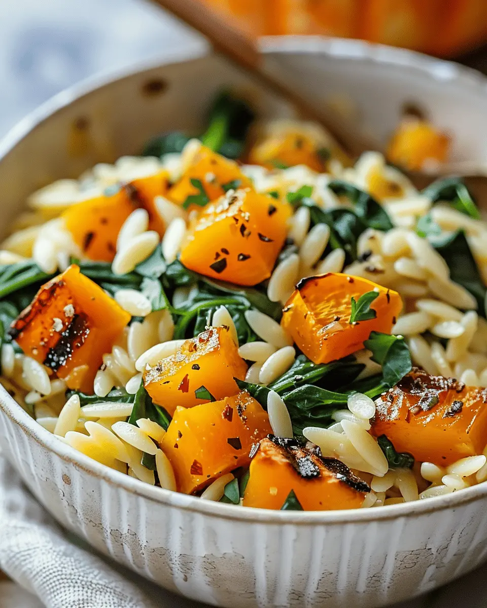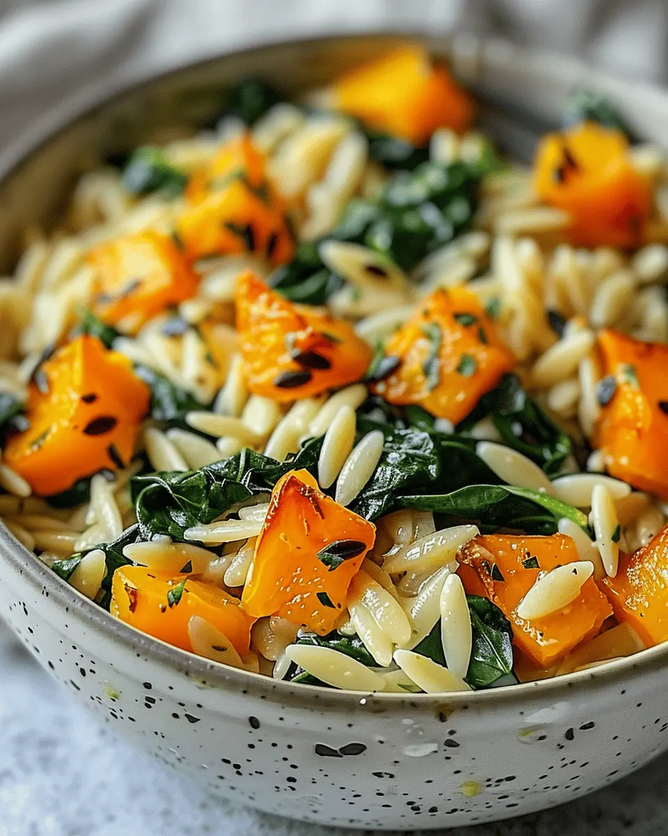 A delicious creamy orzo dish featuring roasted butternut squash and fresh spinach, perfect for any meal.