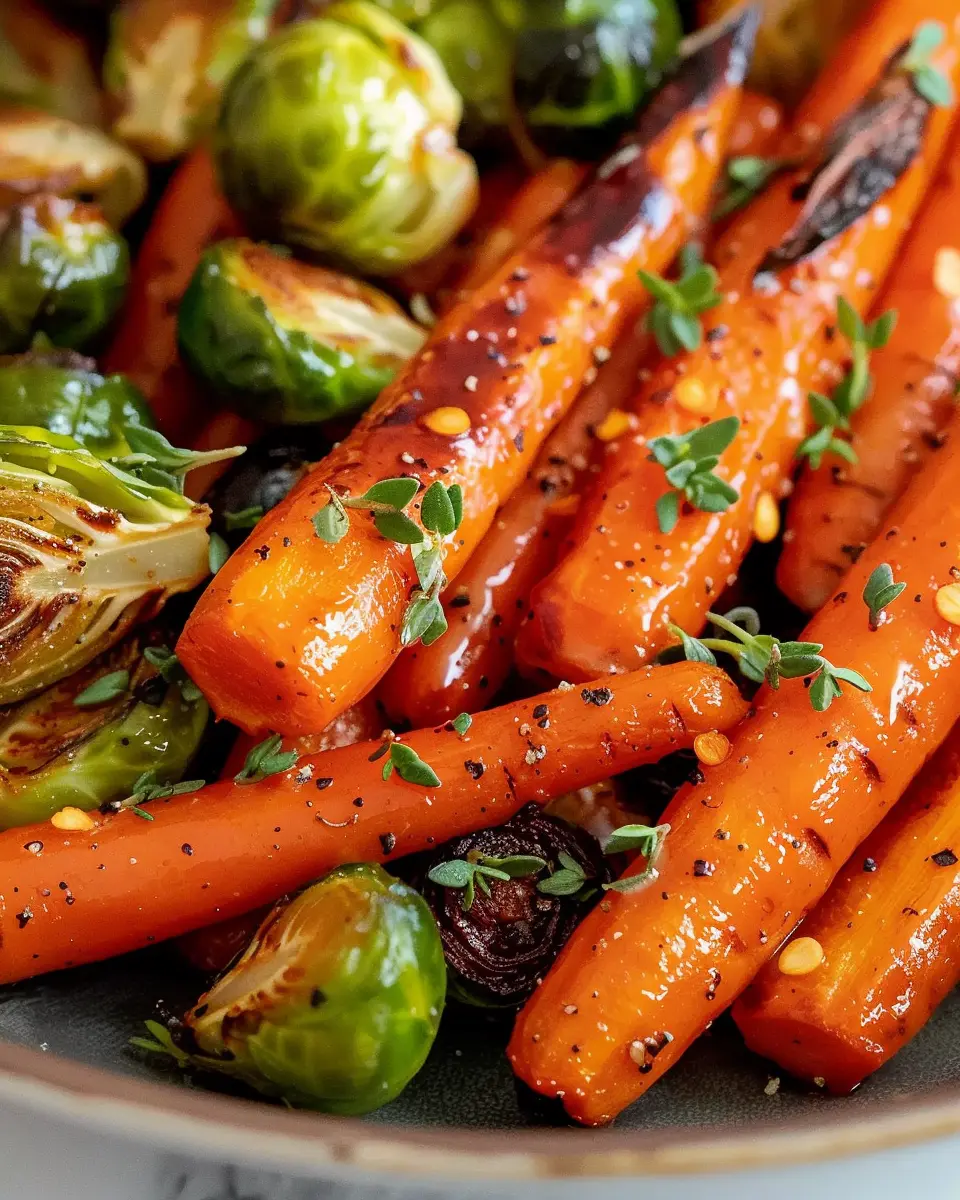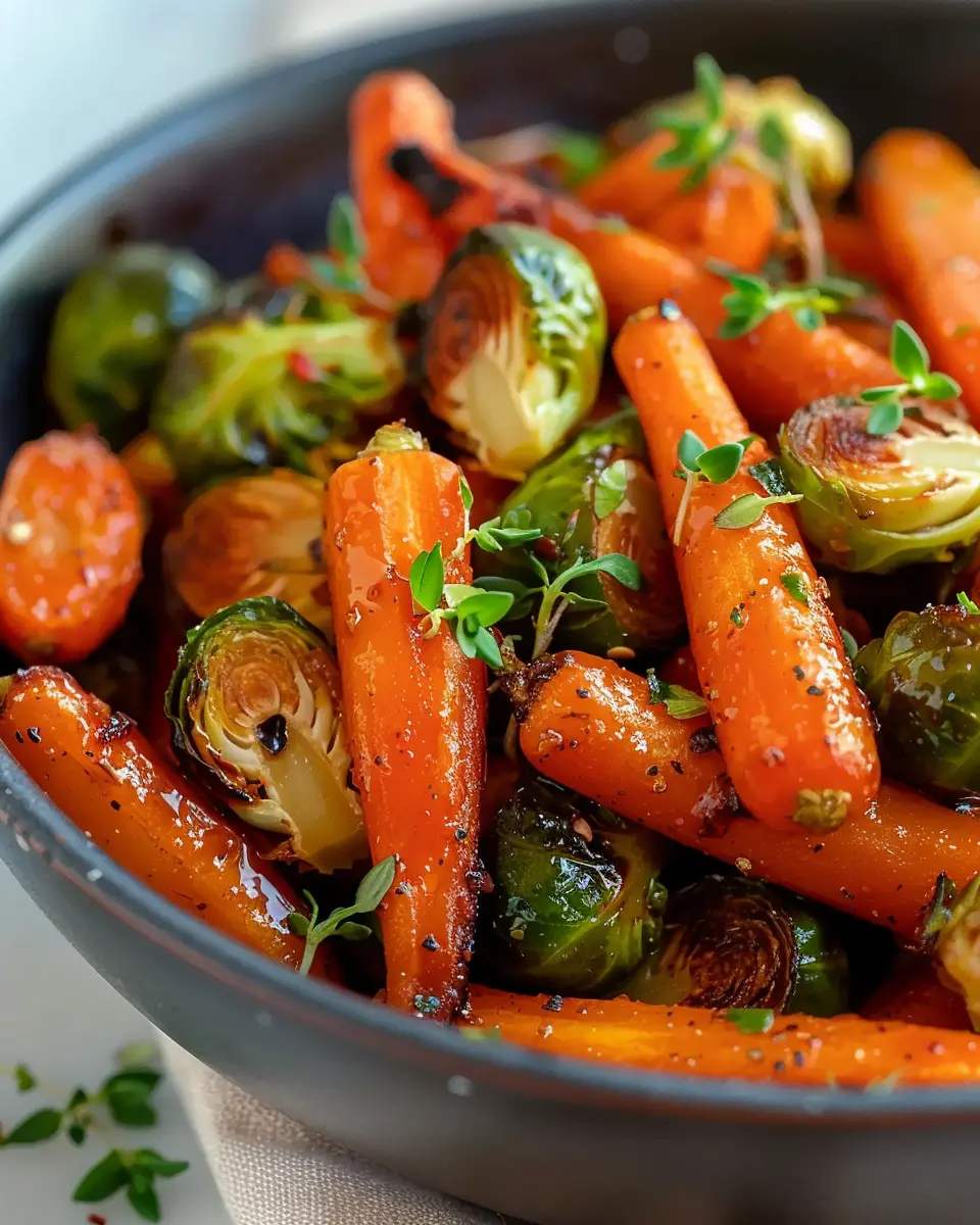 A delicious side dish featuring crispy maple glazed carrots and brussel sprouts, enhanced with turkey bacon.