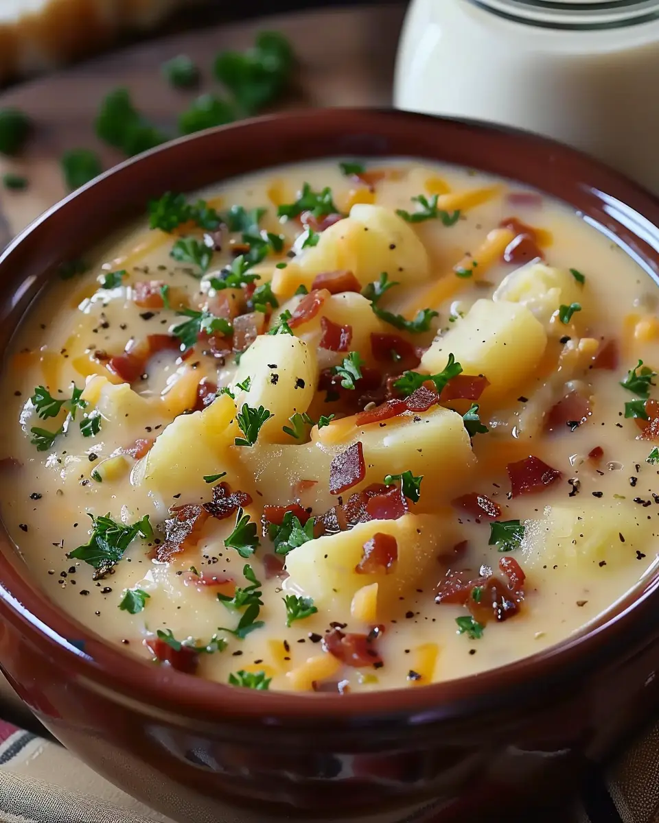 A delicious and creamy potato soup made in a crock pot with turkey bacon and chicken ham, perfect for a cozy meal.