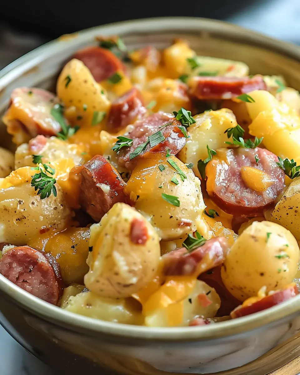 A delightful and easy-to-make crockpot recipe that combines cheesy potatoes and kielbasa.