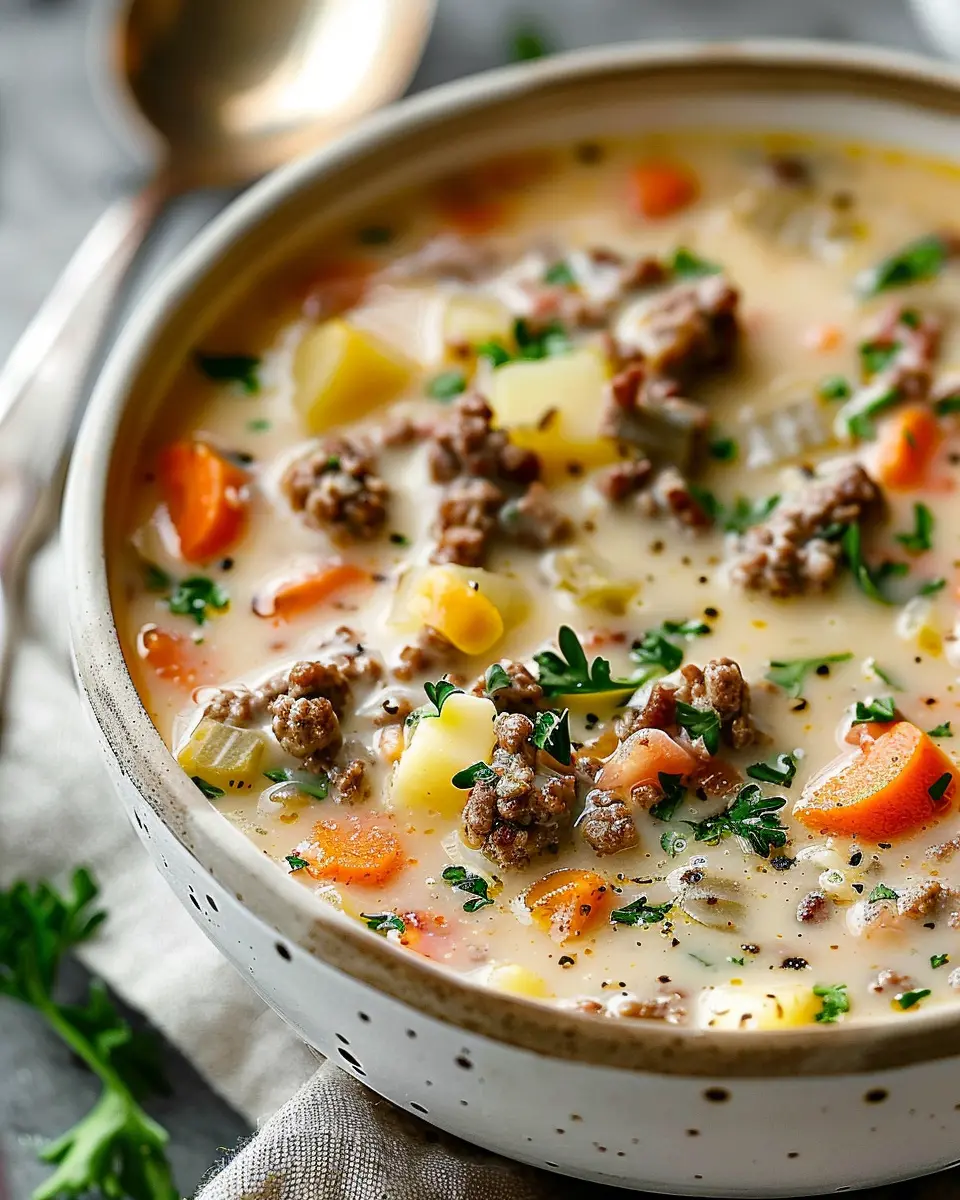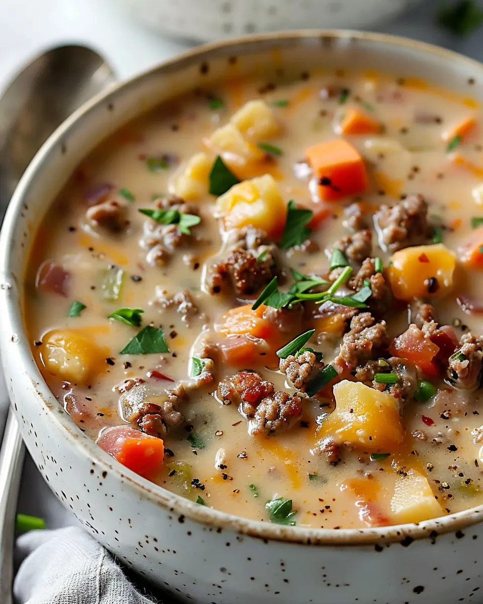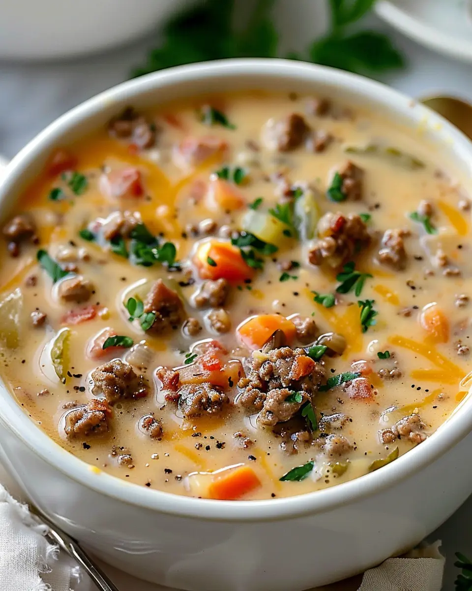 A creamy and hearty cheeseburger soup that combines all the flavors of a classic cheeseburger in a comforting bowl.
