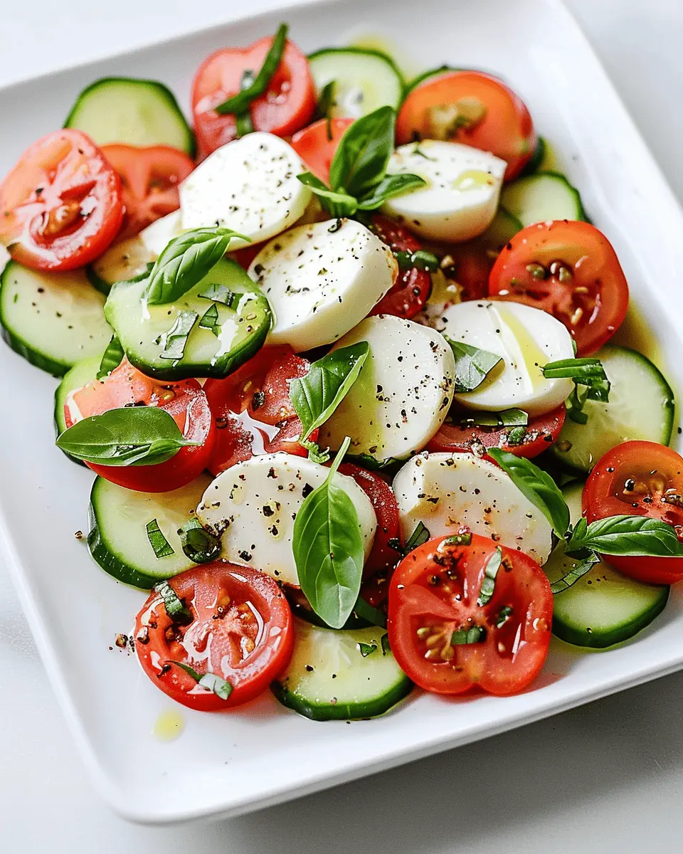 The fresh cucumber caprese salad is incredibly versatile. Feel free to customize it by adding ingredients like roasted turkey bacon or chicken ham for some protein. You can even toss in your favorite nuts or seeds for an extra crunch. The beauty of this salad lies in its adaptability—make it your own!