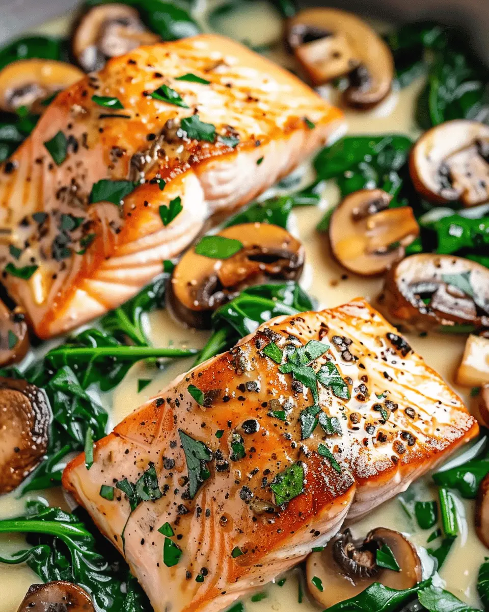 Indulge in a delightful garlic butter salmon dish that combines the richness of salmon with the freshness of spinach and mushrooms, perfect for a comforting dinner.