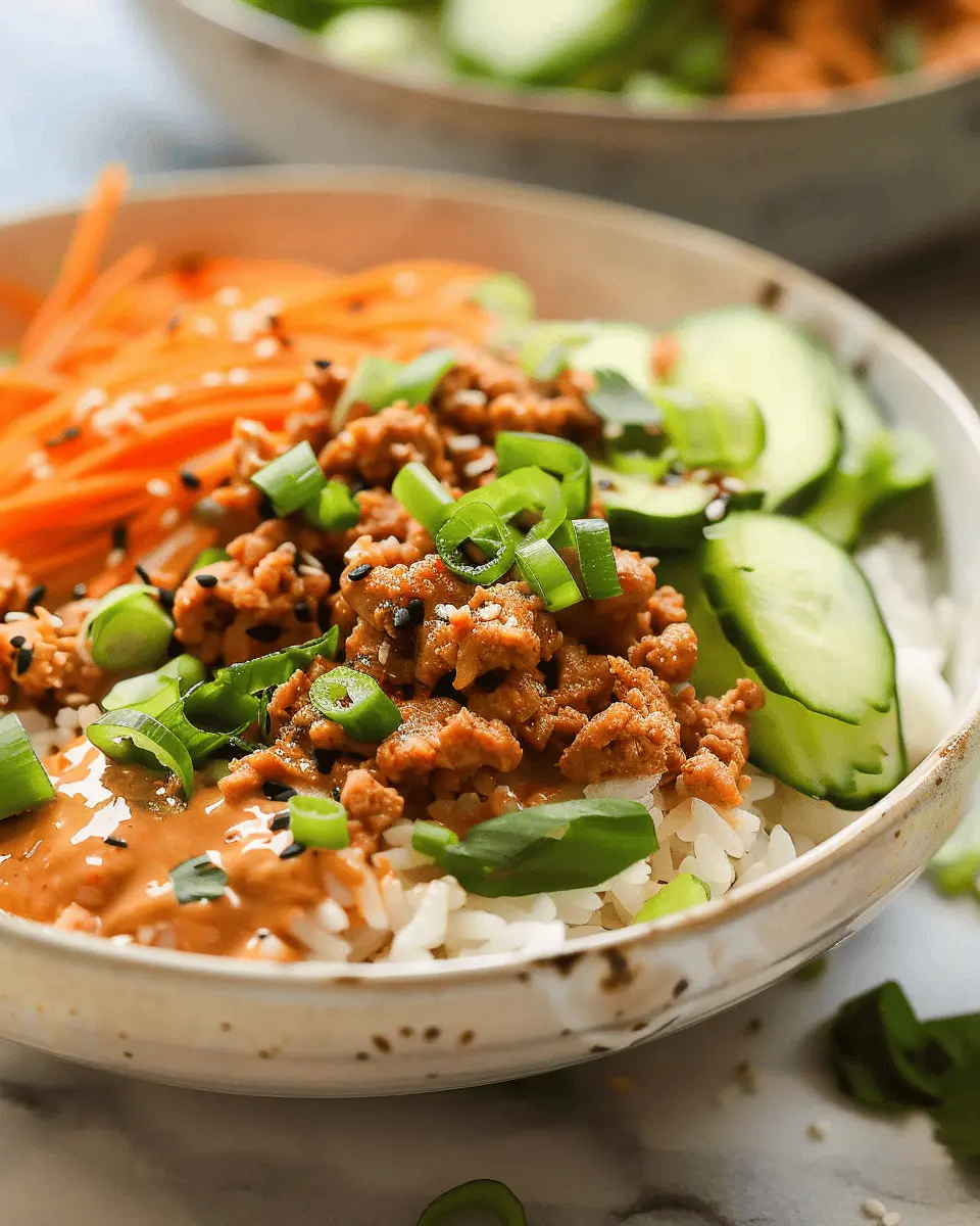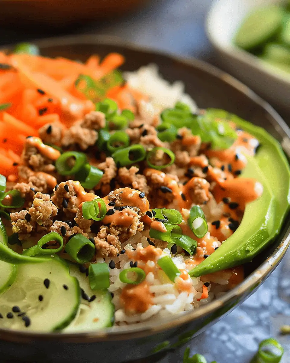 Now comes the most enjoyable part of preparing your ground turkey rice bowls—assembling your delicious creation! Start with a generous scoop of rice at the bottom of your bowl. Top it with your turkey and vegetable mixture, a drizzle of that fabulous Bang Bang sauce, and a sprinkle of sesame seeds and chopped green onions for a finished touch.