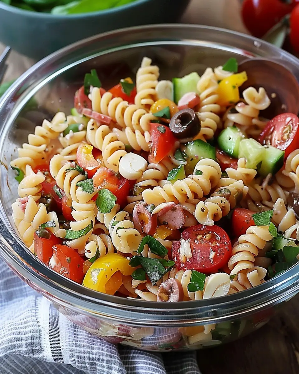 This is where the magic happens! In a large mixing bowl, add your perfectly cooked pasta, chopped vegetables, and sliced meats and cheeses. Stir gently to combine. It’s crucial to mix well to ensure every bite is bursting with flavor. You wouldn’t want a noodle to feel lonely among a mountain of veggies, right? If you like experimenting, consider adding some olives or artichokes for an extra zing!