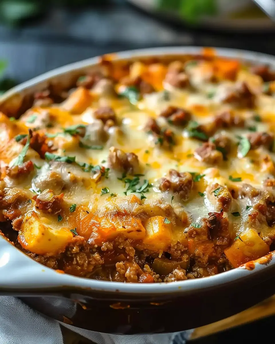 A comforting Hobo Casserole made with ground beef and turkey bacon, perfect for family dinners.