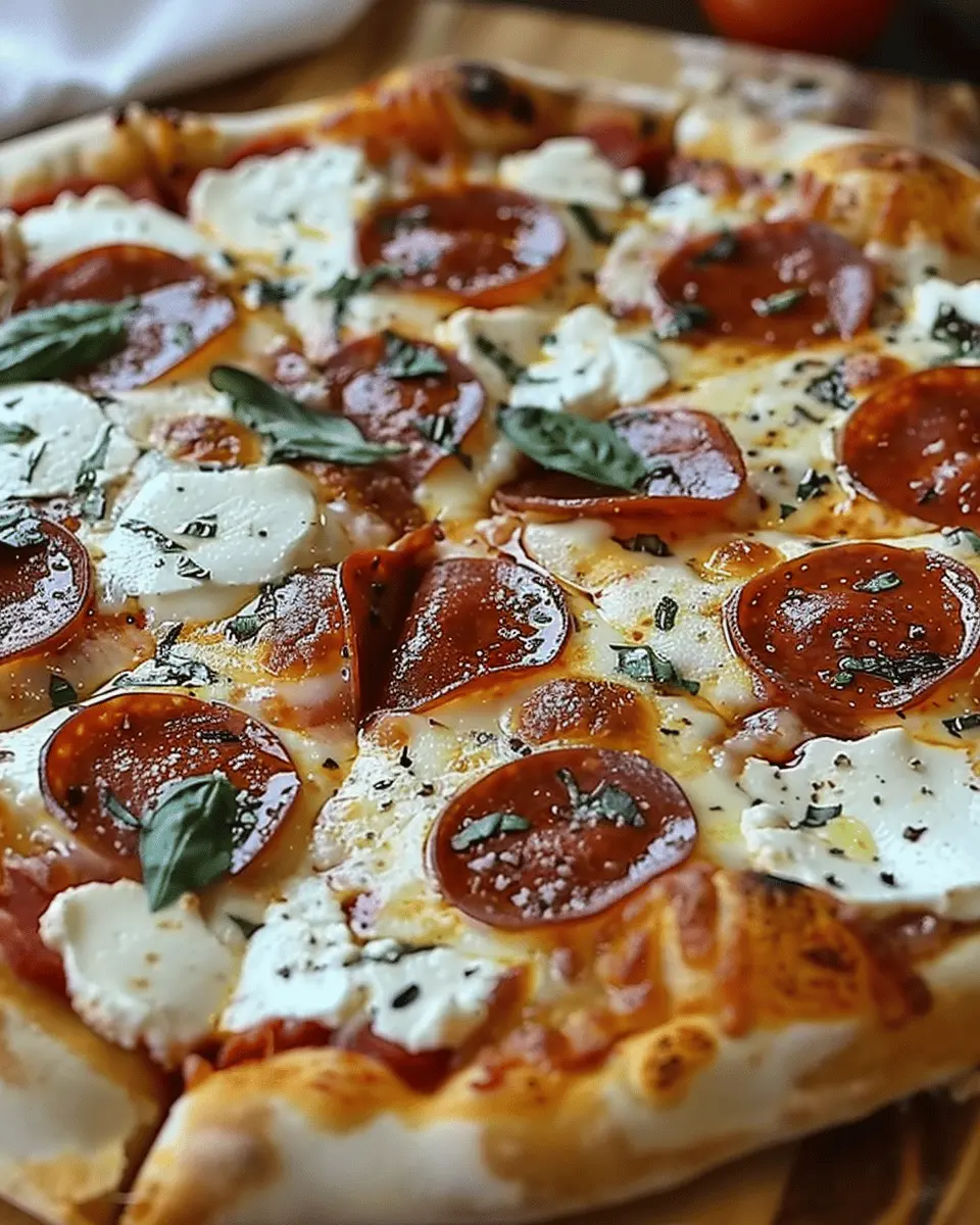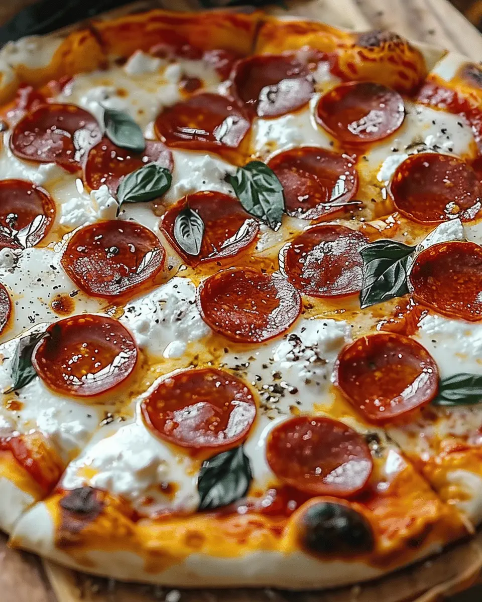 A delightful twist on classic pizza with spicy pepperoni, creamy ricotta, and a drizzle of hot honey.