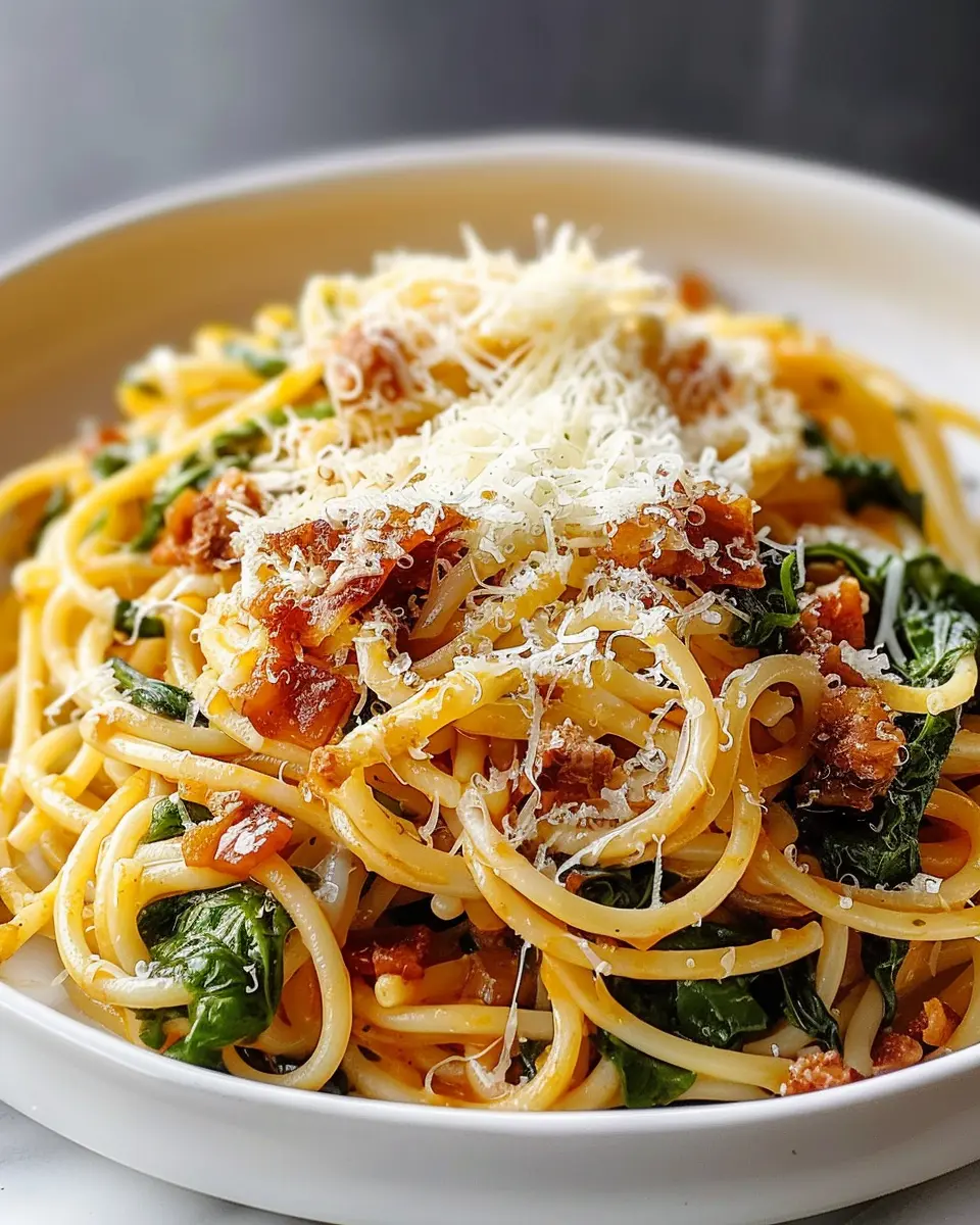 Delicious Monterey Spaghetti featuring turkey bacon and chicken ham, perfect for a quick meal.