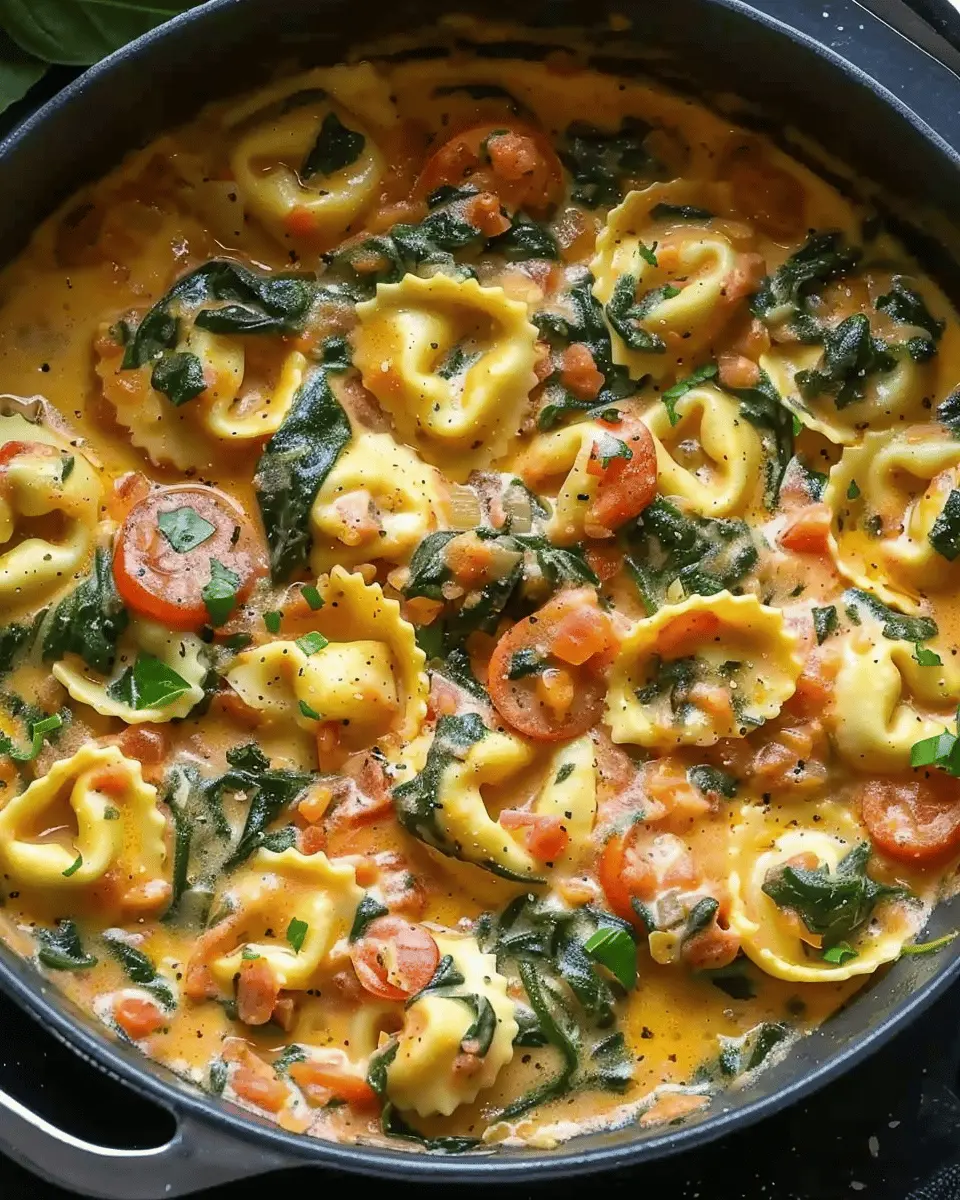 A delicious and creamy one pot recipe that combines spinach, tomatoes, and tortellini, perfect for quick weeknight dinners.